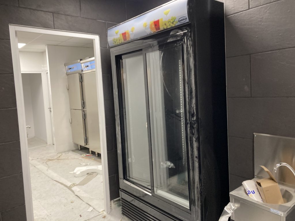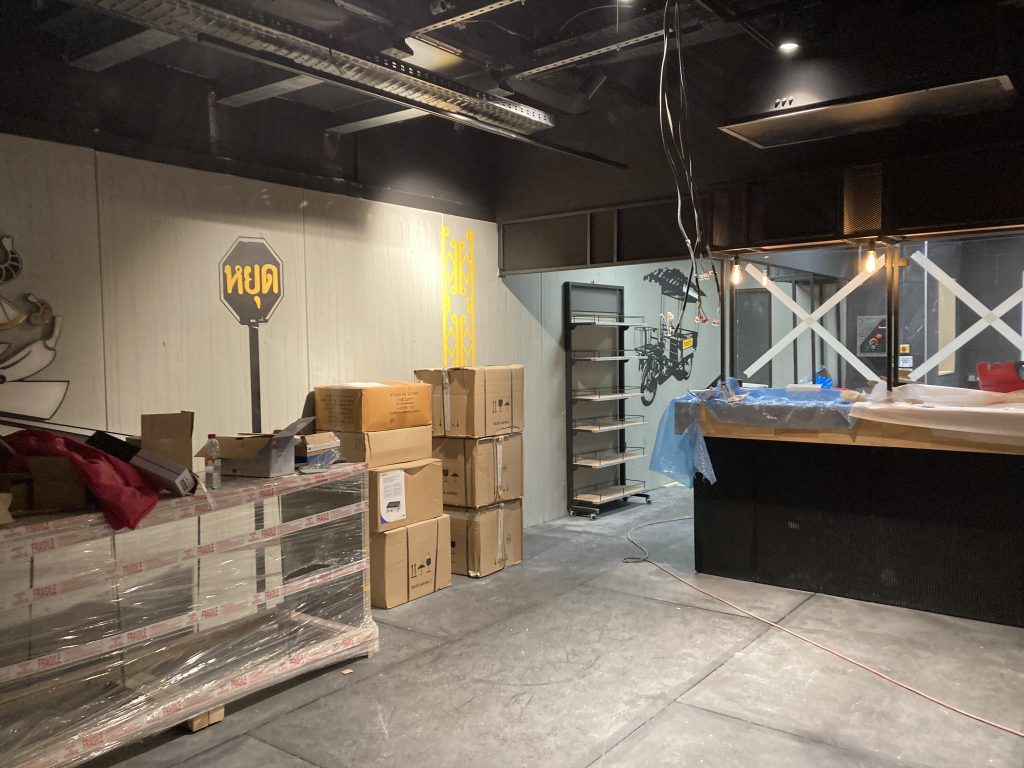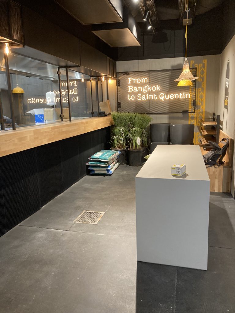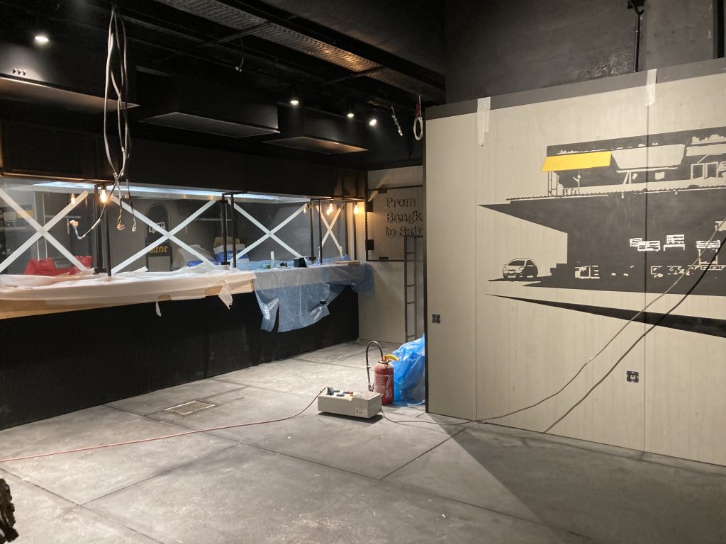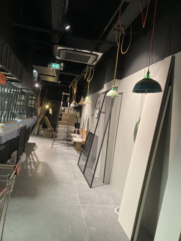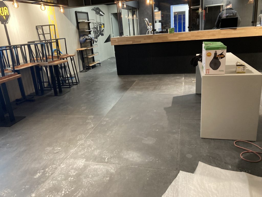 Pose des plaques revêtement béton au mur, pose de la cage métallique pour les WC sous plafondPose de revêtement de sol y compris joints et pose de plaques en revêtement béton, finition avec cornièresFinitions et nettoyage du solFinitions et mise en placePose de revêtement de sol terminéPose de menuiserie intérieurePose de menuiserie intérieureIntérieur terminéLe restaurant terminé, avant son ouverture le lendemain matin 😄