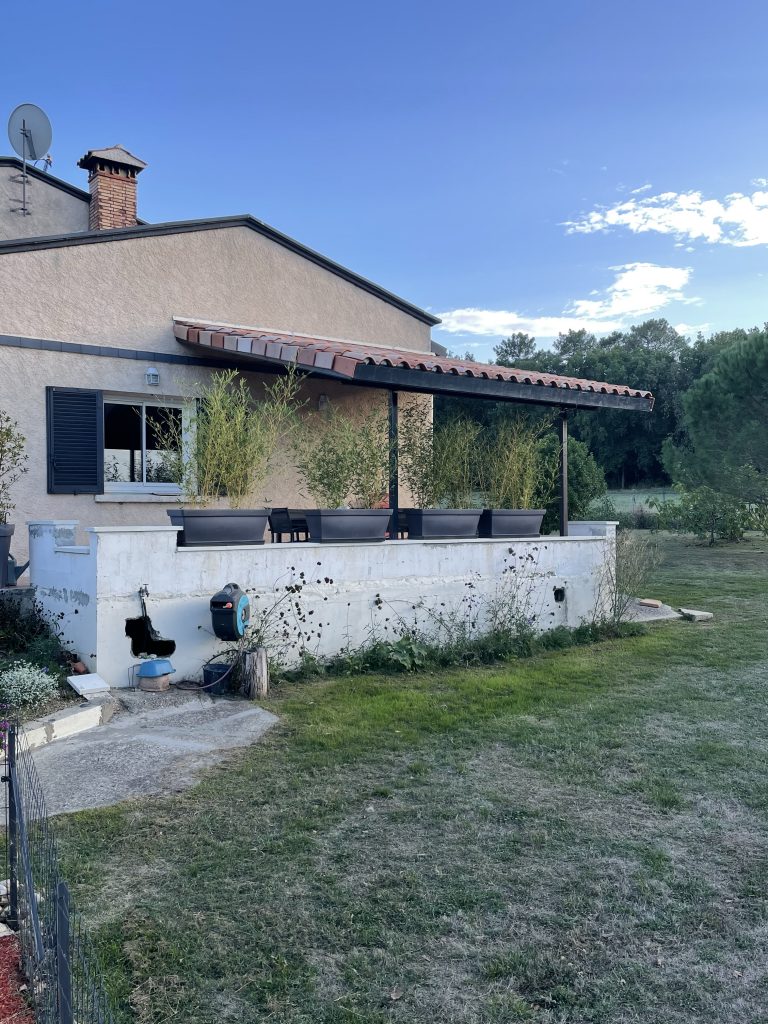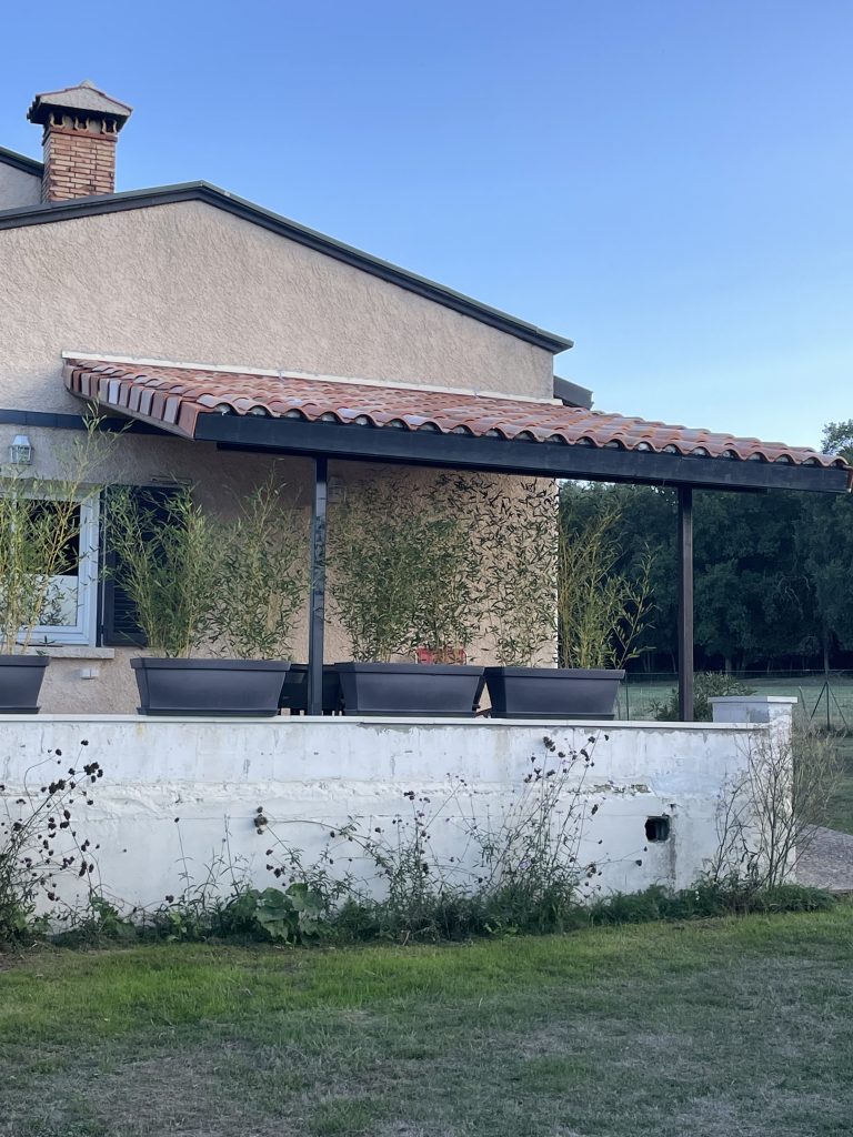 Fabrication d’une pergola en acier avec toiture en tuiles sur une véranda extérieure d’environ 20 m²