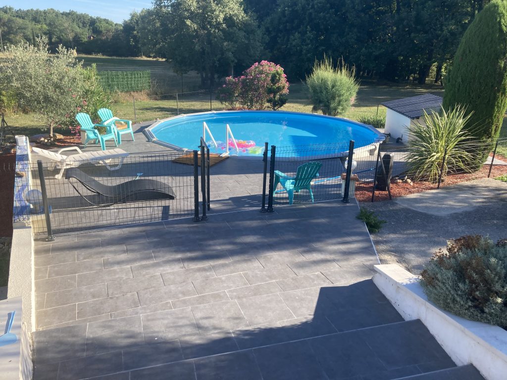Réalisation d’une terrasse en carrelage autour de la piscine avec margelles