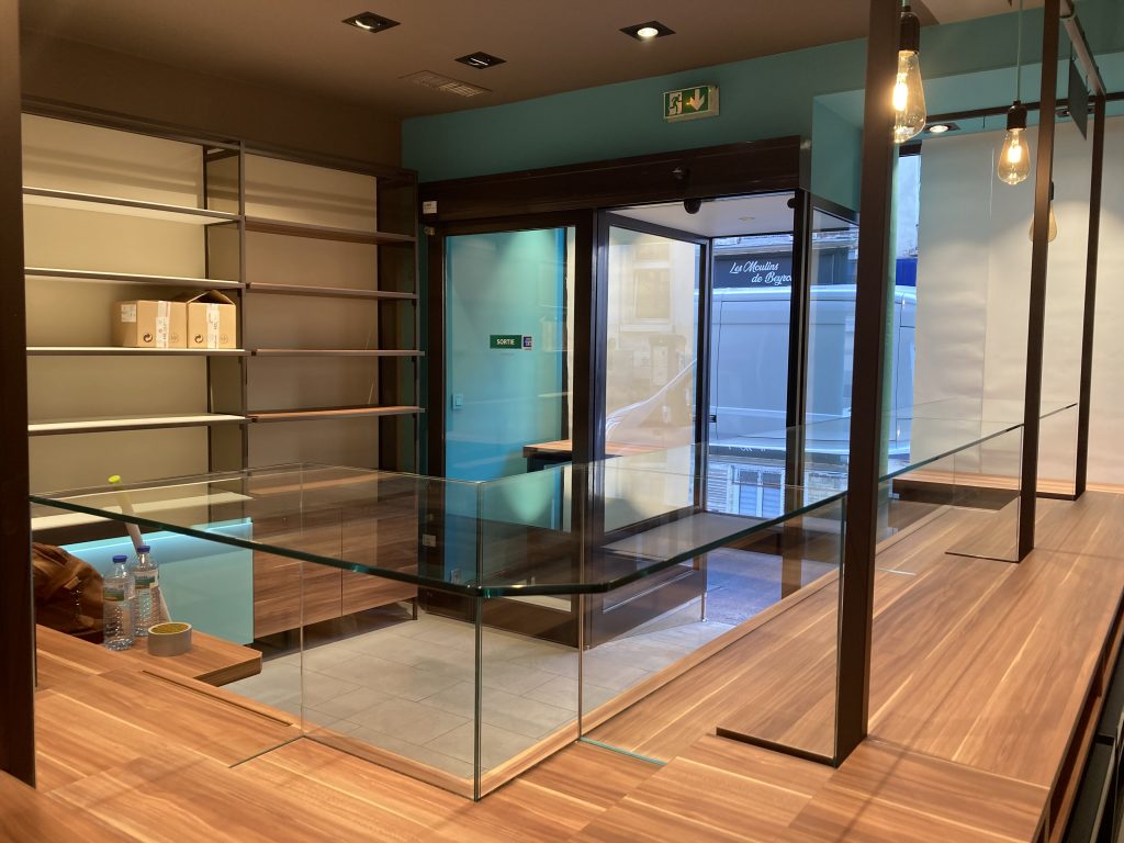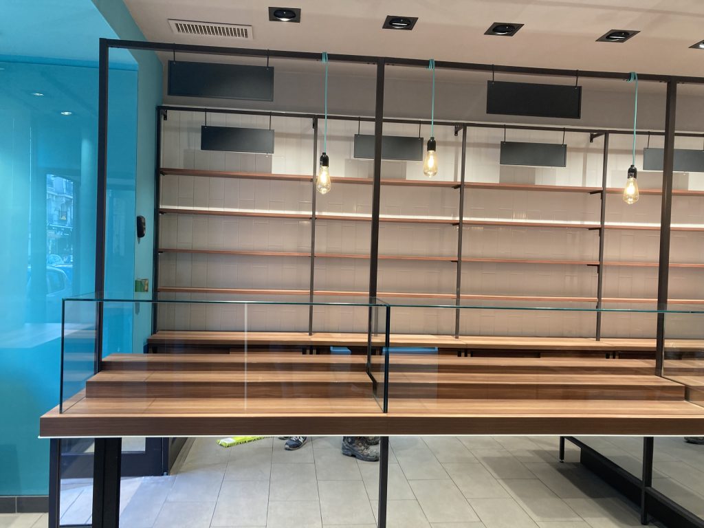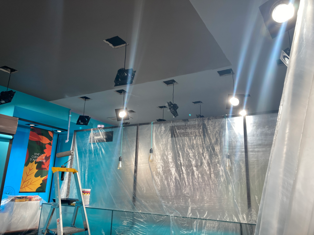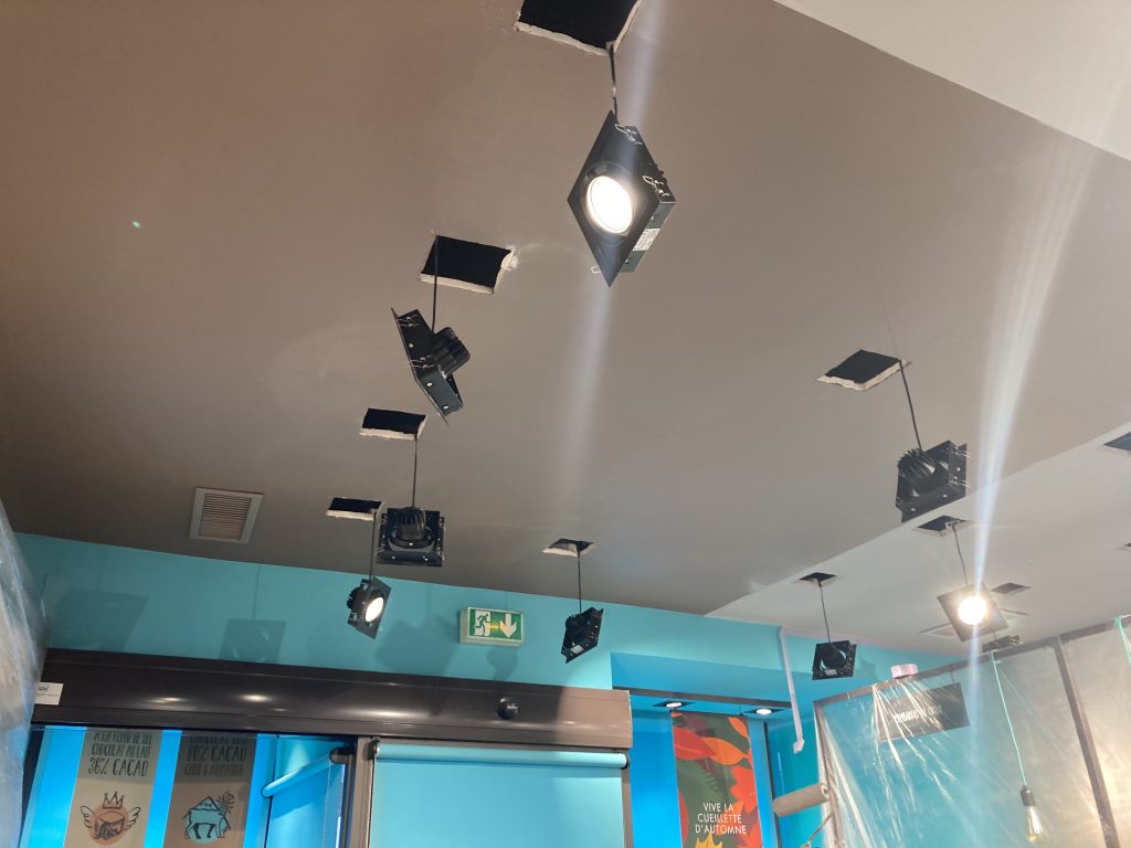 Dépose des anciens spotsProtection de la boutique, dépose des spots, mise en peinture du plafond en bi-couleur, mise en peinture des murs, pose de carrelage muralPose de carrelage muralPose de carrelage muralFabrication et pose d’un portillon pivotant dans une boutique Pose des nouveaux spots, mise en place du mobilier, nettoyage avant mise en place des produitsIntérieur terminéRénovation de la peinture de la façade et de la porte, du bandeau de l’enseigne, pose de la nouvelle enseigne, repose de l’enseigne drapeau Travaux terminés !! 😄😄